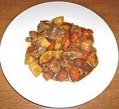 Pulpa de porc taiata cuburi o prajim in untura incinsa, adaugam ceapa maruntita si usturoiul pisat, condimentam si asezonam cu mustar, sare, piper, chimen si maghiran, turnam jumatate din cantitatea de bere (250 ml), apoi, sub capac, lasam la foc mic sa se fragezeasca (aproximativ 45 de minute). Intre timp curatam cartofii si morcovii, respectiv ii taiem felii mai groase, aruncam peste carne si, tot sub capac, turnand restul de bere si pasta de tomate peste masa de carne, lasam sa se intrepatrunda (circa 15-20 de minute, la foc domol). Din amidon (faina) si boia formam o pasta cu cateva linguri din sosul gulasului si turnam peste, mestecand pana la omogenizare. Servim imediat cu smantana si frunze de patrunjel verde.