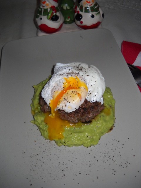 Se serveste pe farfurie 1-2linguri pasta de avocado, deasupra hamburgherul apoi oul poshat.
