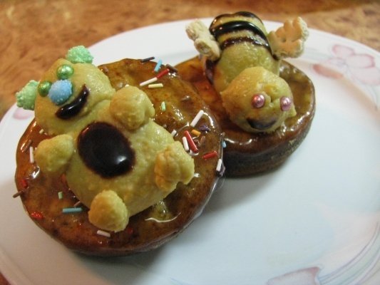 3. Se ung briosele racite, pe deasupra, cu glazura.Se orneaza cu albinute si ursuleti, si se decoreaza, dupa dorinta, cu bombonele colorate, ciocolata etc.