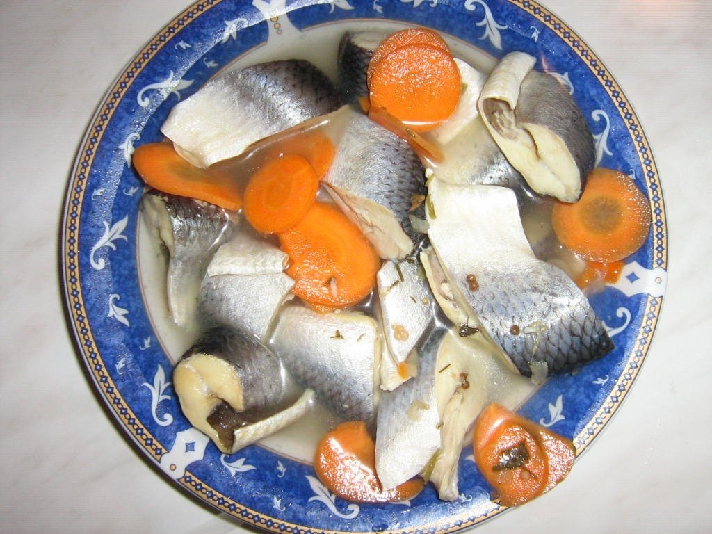 Heringul se taie in medalioane (rondele) groase de 1,5-2 cm si apoi se tine la rece. Ceapa se taie solzisori, iar morcovul in rondele.
