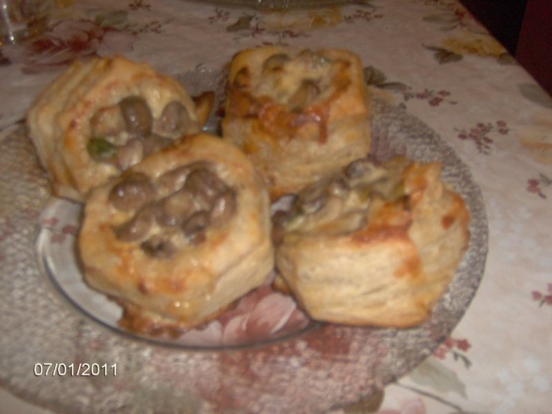 Se pun hexagoanele pe o tava cu pergament si se coc la 180 de grade-cuptorul incalzit dinainte-25-30 de minute pina se aureaza frumos .Scoatem tava din cuptor si apasam pe capac sa se lese in jos.Umplem cu umplutura de ciuperci si mai coacem 15 minute dupa care se pot servi.