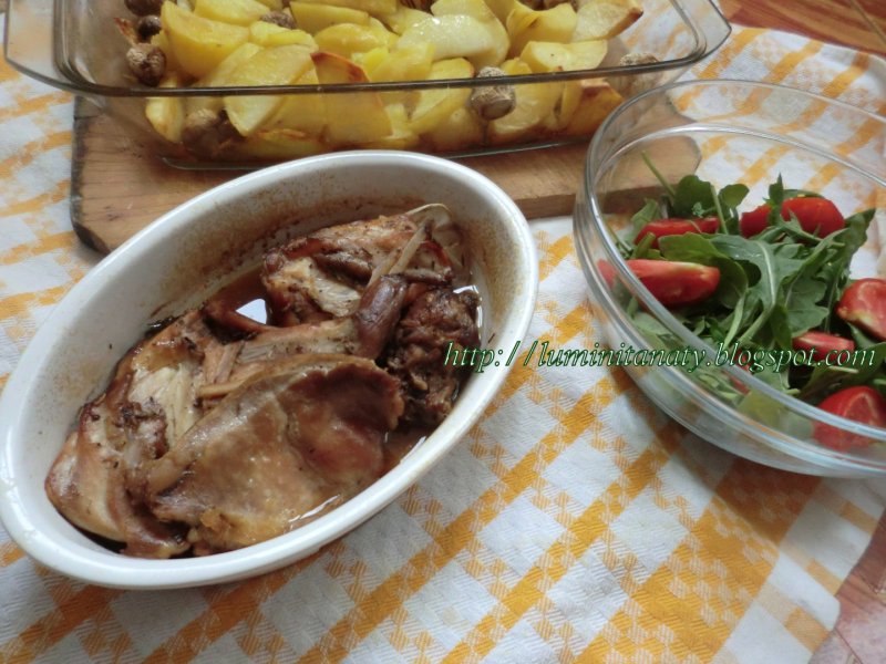 dupa care se toarna paharul de vin alb se lasa sa sfaraie frumos :) si se pune tava la cuptorul incins la treapta 7 pentru 10 min. asa scrie reteta. Fiindca am avut un iepure de casa care se gateste mai greu am pus tava la treapta 4 am acoperit o si am lasat sa se inabuse timp de 30 min. A iesit o minunatie de carnita.