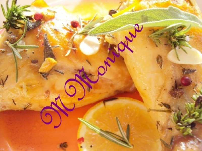 Spălaţi plantele aromatice şi tocaţi cimbrul şi rozmarinul. Spălaţi şi decojiţi lămâia, păstraţi cojiţele. Stoarceţi lămâia peste iepure, adăugaţi sare, piper negru proaspăt măcinat, coriandru, cimbrul şi rozmarinul tocat şi vă îngrijiţi să impregnaţi carnea de iepure cu aceste arome.