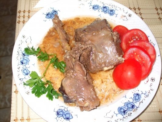 Carnea se spala, se curata de pielite si se pune la fiert in apa rece (se poate pune si in oala subpresiune).Dupa ce carnea da in fiart, se scoate , se spala si se da deoparte.Intre timp ceapa se curata, se spala si se taie julien, se caleste usor in ulei.Dupa ce se caleste ceapa, se pune carnea.Se intoarce pe toate partile picand din cand in cand cate putina apa fiarta si se acopera.Se adauga vinul, putina sare, piperul si se lasa la foc potrivit pana se patrunde carnea.