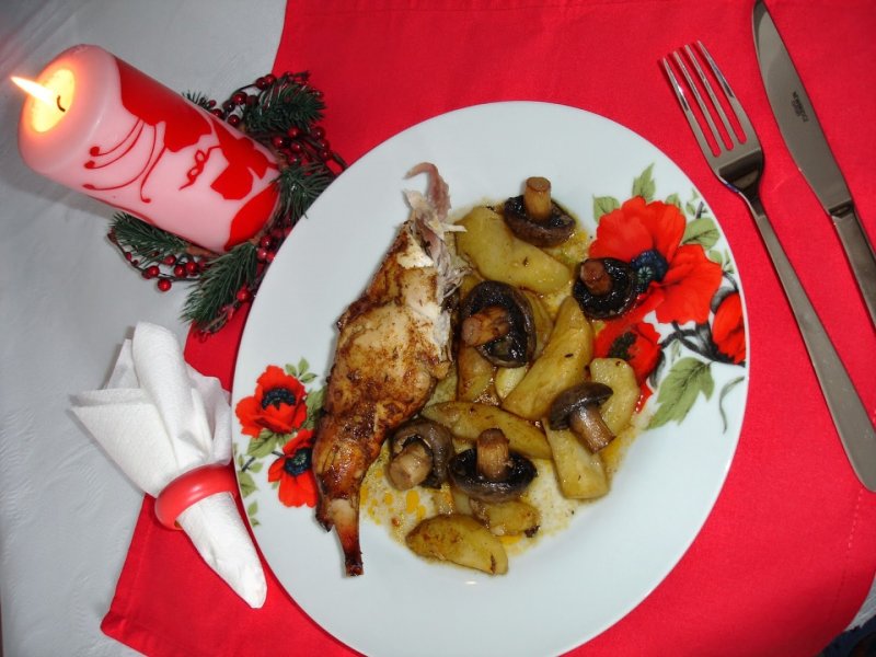 Facem un bait din ingredientele de mai sus, crestam iepurele si-l inpanam cu usturoi si slanina. Ungem iepurele si-l dam la rece pana a doua zi. Punem in tava aragazului cartofii taiati in 4, ciupercile intregi, presaram boia, curry, cimbru, putin si putin ulei, Punem iepurele intreg si 2 cani de apa. Acoperim cu folie si dam la cuptor vreo 30 de minute dupa care inlaturam folia si lasam sa se rumeneasca. Ungem iepurele din cand in cand cu sosul din tava. Cine doreste poate sa-l stinga cu o cana de vin rosu sau alb.