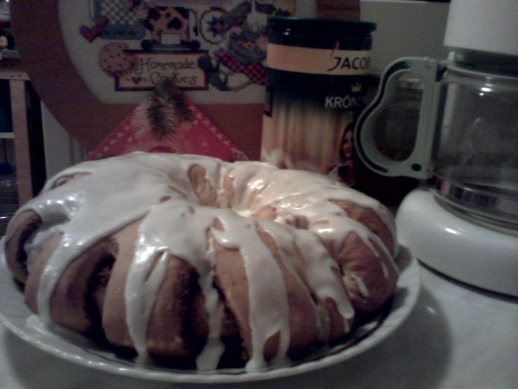 Amesteca zaharul pudra cu laptele si vanilia si toarna peste inelul caldut.