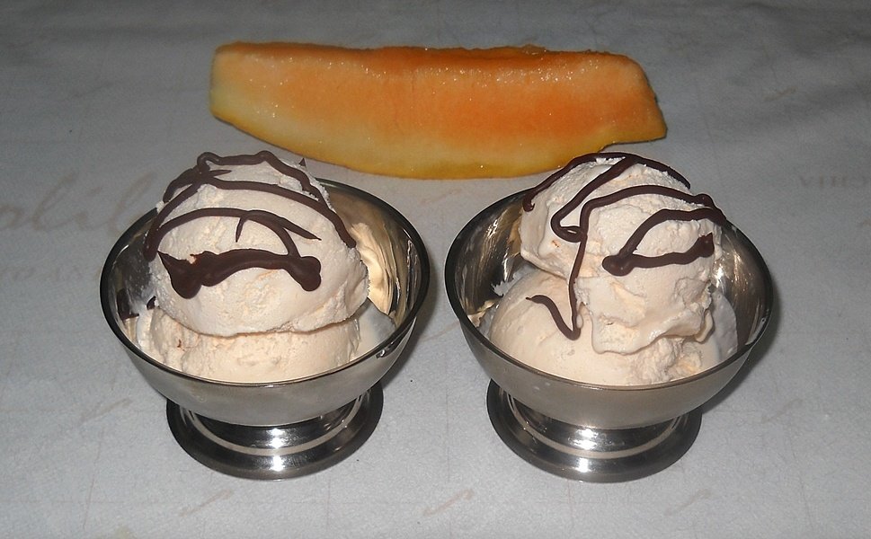 Incorporam piureul de pepene in frisca batuta, amestecand usor cu o spatula.