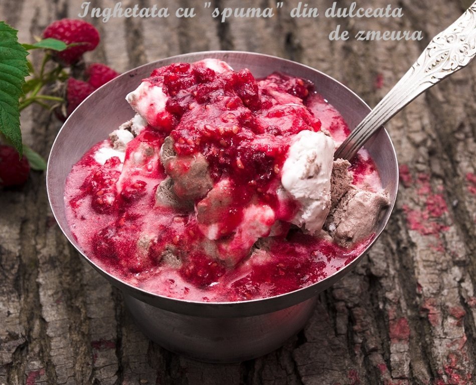 Pentru spuma din dulceata de zmeura.... e simplu puneti fructele la fiert cu zahar, exact ca la dulceata de zmeura si in timp ce incepe a fierbe se va ridica la suprafata o spuma. Culegeti-o cu o lingura de lemn si catarati-o sus, drept topping, pe un mormat de inghetata.