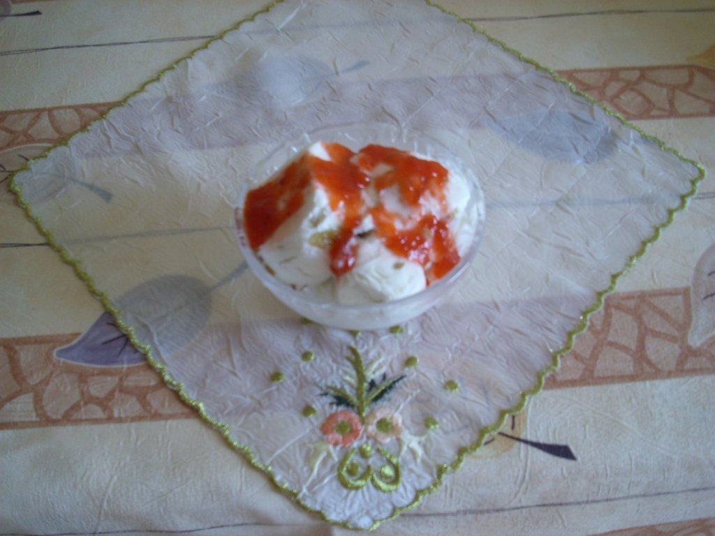 Se bat albusurile cu zaharul, dupa care se adauga frisca, nucile , alunele, smochinele si stafidele, se amesteca totul usor si se pune in masina de inghetata. Se serveste cu sos de capsuni sau orice alt topping.