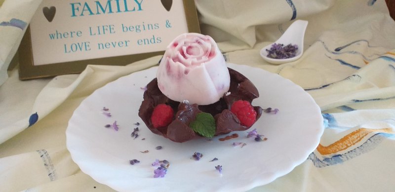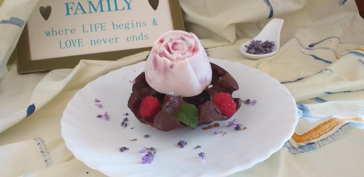 Cand ciocolata s-a intarit inlaturi usor cuburile de gheata. Vei obtine astfel o "cupa" speciala , in care asezi cate o briosa de inghetata, zmeura, lavanda si menta.