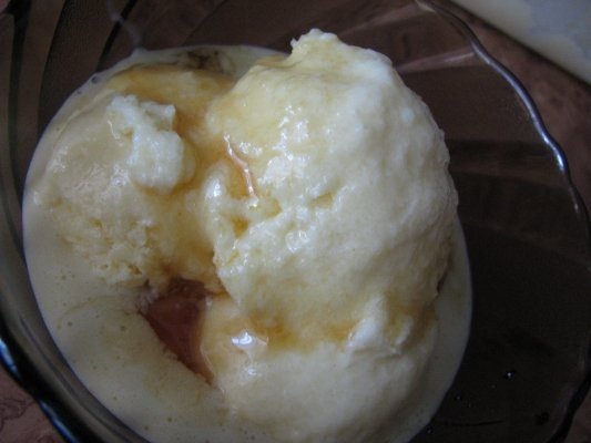 1. Se bat , intr-un vas, galbenusurile cu 100 gr miere si zahar, apoi se toarna, treptat, laptele fierbinte.Se pune vasul intr-o baie de apa rece si se amesteca pana ce se raceste.Se inglobeaza apoi frisca batuta, coaja de lamaie rasa, cardamomul si esenta de vanilie.Se pune compozitia obtinuta intr-un vas de plastic si se lasa sa se intareasca la congelator 3-4 ore, apoi se scoate, se amesteca cu mixerul si se introduce din nou la congelator pentru inca 4 ore.Se repeta acesta operatiune de inca 1-2 ori, iar la urma se serveste.