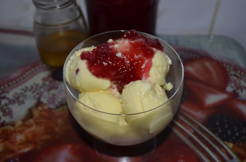 Intr-un bol se pun galbenusurile, 4 linguri de zahar si se mixeaza pana se obtine o spuma densa, dupa care se toarna in cratita cu lapte de la bain marie. Se amesteca usor cu o paleta pana ajunge crema la temperatura de circa 80%,daca nu aveti un termometru este bine sa nu se ajunga la fierbere deoarece se poate taia crema.Se opreste focul,se adauga sucul de soc si putina dulceata de trandafiri.Se poate doar cu suc de soc.Eu am adaugat si dulceata de trandafiri sa fie foarte aromata.Se omogenizeaza bine si se da la congelator pret de 6-7 ore dupa care se poate servi. La mine nu a facut ace de gheata deoarece toate ingredientele sunt naturale si de buna calitate.