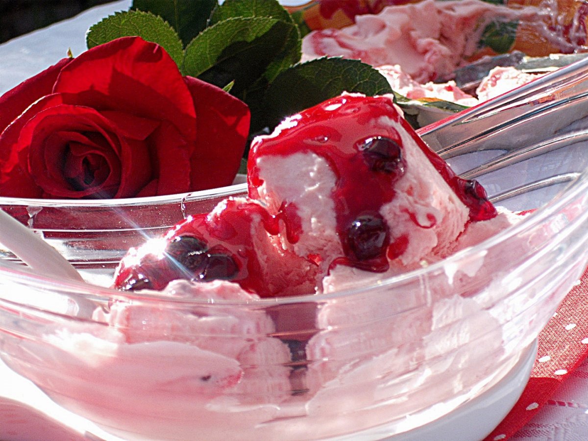 Se servesc ambele inghetate ,amestecate in cupe,stropite cu dulceata de cirese amare si decorate cu frunze proaspete de menta.
