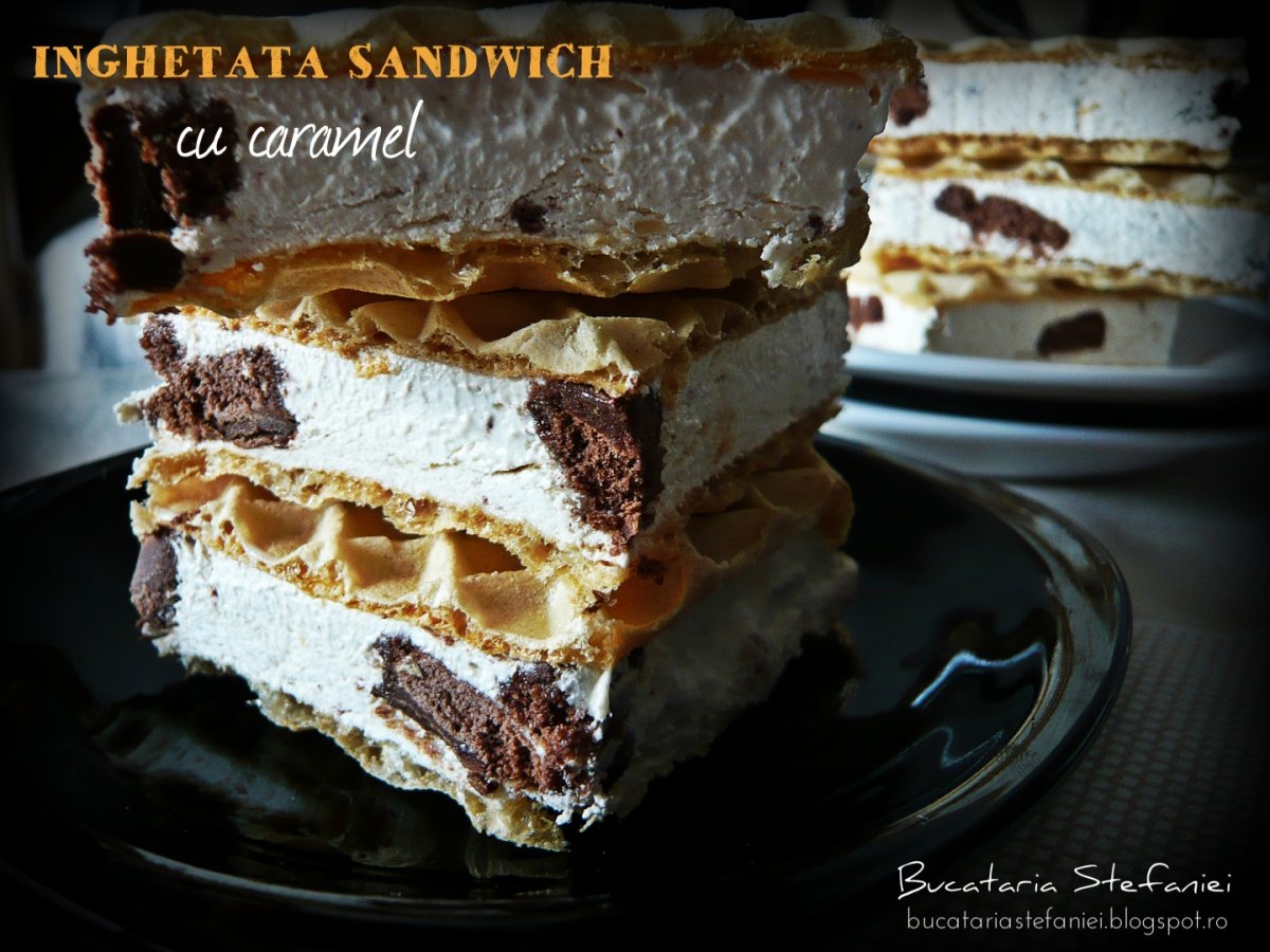 Foile de napolitana pentru a fi mai usor de manevrat pot fi taiate in 2 sau 4 bucati egale. Pe o foaie de napolitana se adauga inghetata cam 1 cm inaltime, se niveleaza cu ajutorul unui cutit de unt si se adauga si cealalta foaie de napolitana.Se preseaza usor si se modeleaza sau se completeaza cu inghetata daca mai este cazul. Asa se procedeaza si cu celelalte foi pana se termina toata inghetata. Se pun una peste alta si se baga la congelator.Dupa 3 ore pot fi devorate!