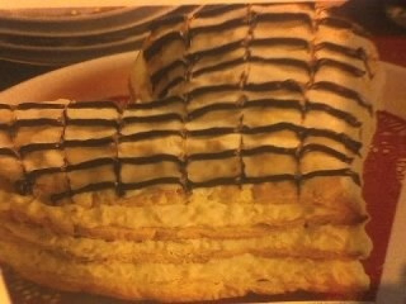 Se desfac inimile de aluat in doua.Se pune un strat pe un platou.Se acopera cu o treime din pudding.Se repeta operatia inca de doua ori.Se acopera cu ultimul strat de foitaj.