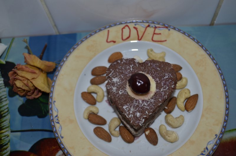 -In alt vas,se pune banana rupta bucati,nuca de cocos,cacao,nuci caju si se mixeaza bine.Se pune compozitia in forma de inimioare,apoi se ia cu un cutit,mai lat, inimioarele si se pun unele peste altele,se orneaza cu felii de banane,nuca de cocos.