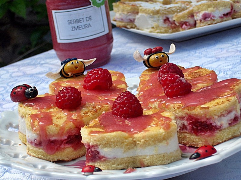 Se aseaza primul blat in tava in care l-am copt, se toarna amestecul de branzica, se toarna cu lingurita dulceata de zmeura pe toata suprafata prajiturii apoi se acopera cu cel de-al doilea blat, se preseaza usor cu mana si se da la rece cel putin 2 ore. Se taie prajitura cu un decupator sub forma de inimioara apoi se glazureaza cu serbet de zmeura.