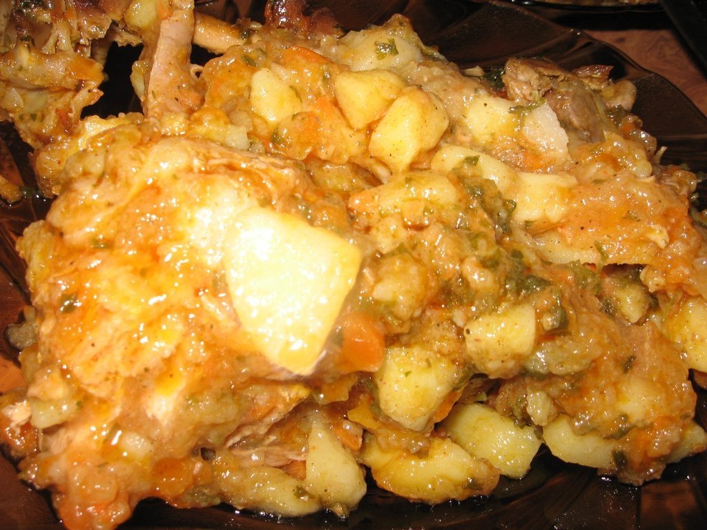 Am undit ceapa intr-un pic de ulei de masline, am pus carnea de curcan, s-a undit si ea schimbindu-si culoarea, am pus morcovul , ardeiul gras si rosiile tocate, am pus boia de ardei, sare, piper, ardei iute, foi de dafin si o cana de apa si am lasat la fiert acoperit, la foc mic si domol.
