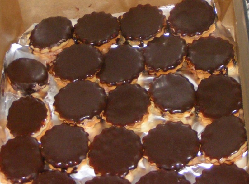Se scufunda pe jumatate in glazura de ciocolata dupa care se pune pe tava pana se intareste ciocolata 10-15 minute la rece).