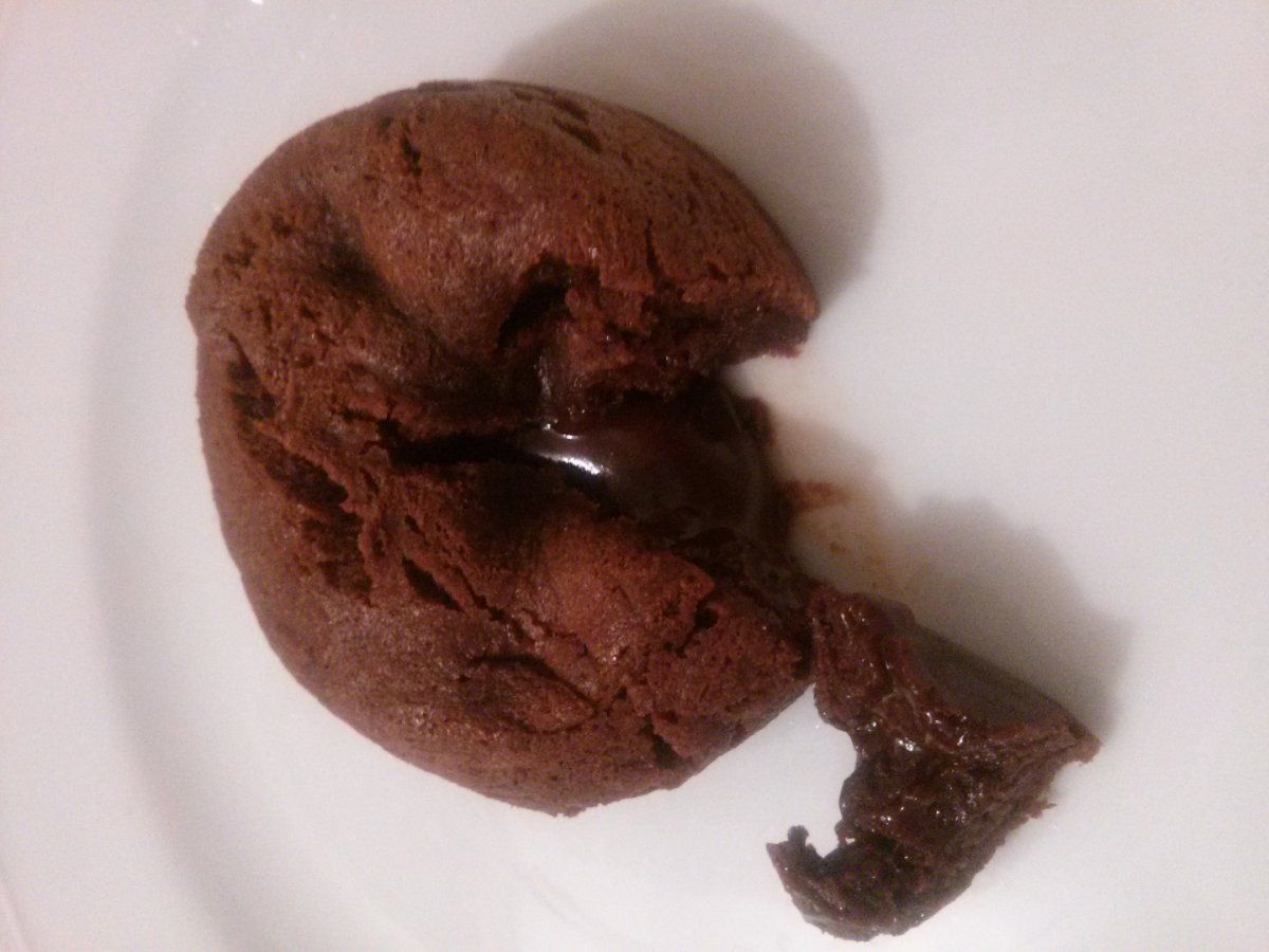 Topiti ciocolata impreuna cu untul la foc mic, la bain-marie amestecand continuu.Dupa topirea ciocolatei adaugati peste aceasta zaharul pudra si amestecati cu un tel pana se omogenizeaza.Adaugati ouale, esenta de vanilie si omogenizati,apoi adaugati faina, praful de sare si amestecati.Compozitia se pune in forme de briose in cuptorul preincalzit la 200 de grade timp de 10 minute.Aceasta compozitie este pentru 4 portii