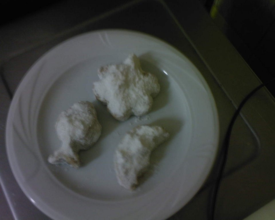 Untul se amesteca cu zaharul, galbenusurile, sucul de portocale, apa de trandafiri, faina in ordinea enumerata.Se adauga toate aromele amaestecate in prealabil cu Ouzo si Metaxa,apoi restul ingredientelor si se framanta gentil,doar ca sa se amestece si sa se lege ingredientele.Aluatul se intinde in foaie de doua degete grosime.Se da la rece 1/2 de ora.Traditional se decupeaza si se modeleaza in semilune,dar mai nou se decupeaza cu diferite forme decorative.Se asaza in tavi neunse si se dau la cuptor. Prajitura nu este dulce asa ca se poate servi unor persoane care sufera de diferite afectiuni.Dar pentru toti ceilalti se unge cu ajutorul unei pensule cu apa de trandafiri si se pudreaza din belsug cu zahar pudra.