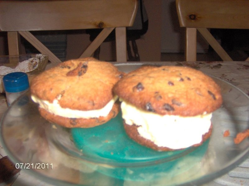 Pe o farfurie asezam prajiturelele punem pe ele o portie de inghetata de vanilie si ii dam forma prajiturii..Punem o alta prajiturica deasupra si facem astfel un sandvici-ca o casata.Bineinteles se pot folosi si biscuiti lati.Dar prajiturelele cu ciocolata dau un gust aparte inghetatei.Lasam citeva ore la frizer sa se intareasca si putem servi.Este ceva mai deosebit de a servi inghetata.