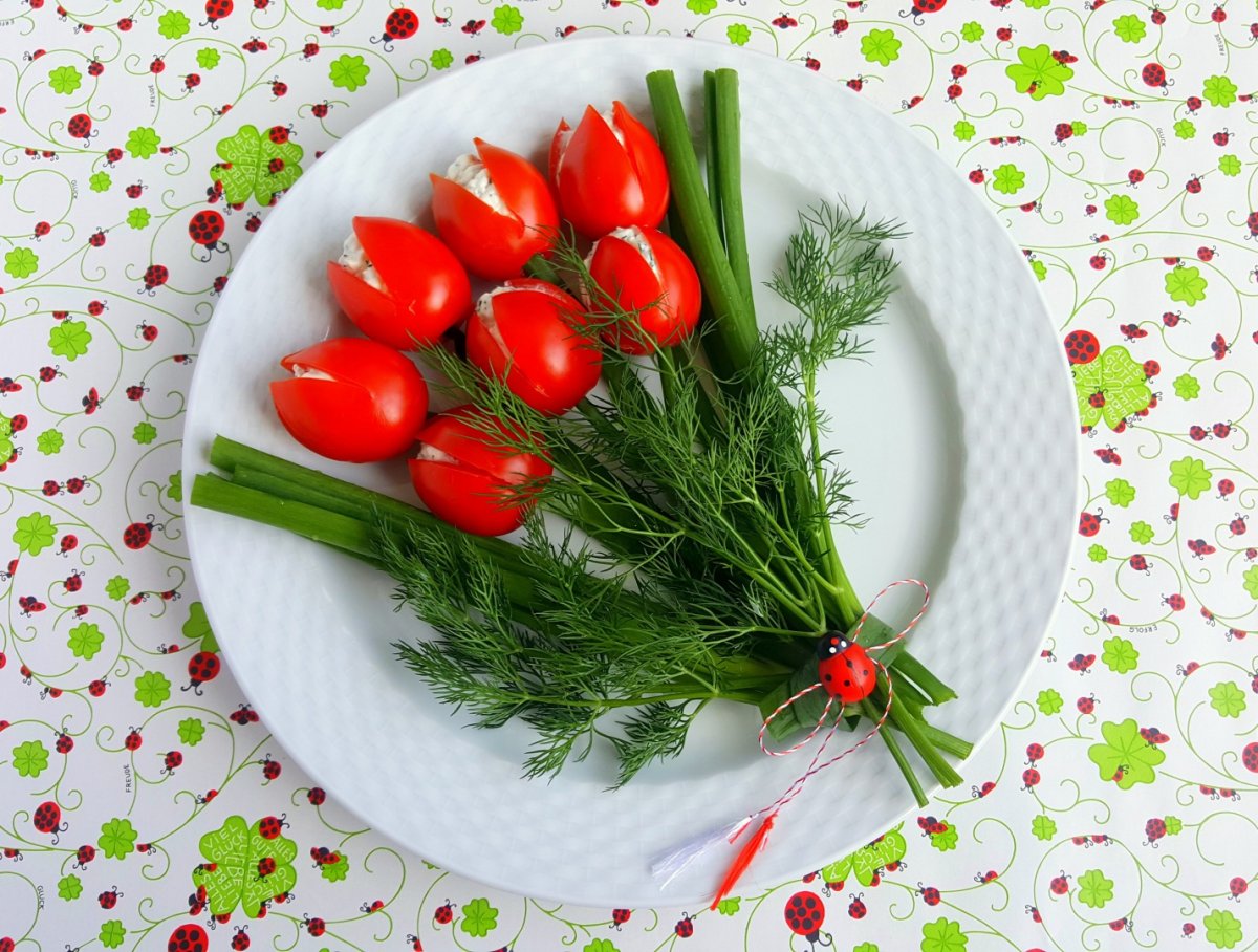 Se asaza doua cepe, fara partea alba, langa lalele din rosii, iar deasupra se pun patru fire de marar (spalate). Se leaga buchetul de lalele cu un fir de ceapa.