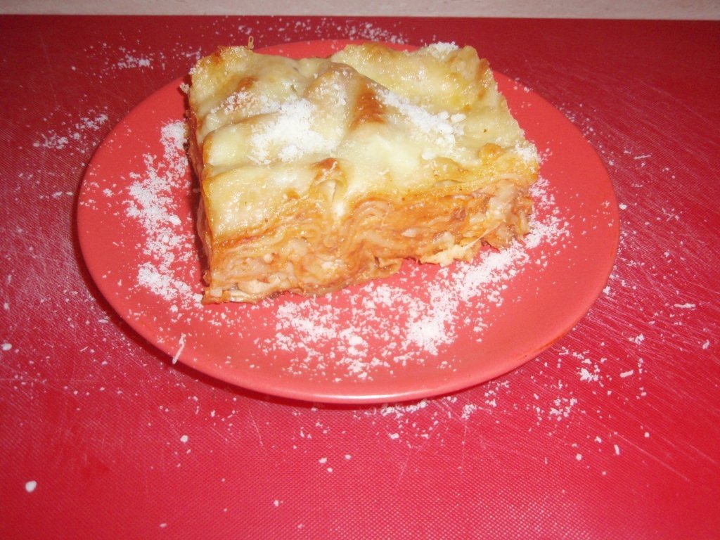 Se aseaza in tava un strat de Ragu, un strat de foi de lasagna apoi un strat de Ragu, sos Bechamel, mozzarella, parmezan, un strat de foi, Ragu, Bechamel, mozzarella si parmezan. Ultimul strat este format din foi, Bechamel si mozzarella. Se da la cuptor 40 de minute la foc mic.