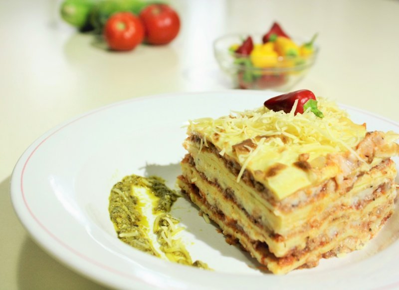 - Se urmează această procedură până se termină compoziția sau până se construiește lasagna de înălțimea dorită. Eu am făcut și extra 3 clătite bolognese împăturite;