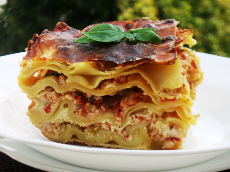 Intr-o tava de cuptor, intindem pe rand, foi de lasagna, turnam jumatate de cantitate din ouale batute cu smantana, presaram branza rasa si adaugam pieptul de pui cu sucul de rosii.