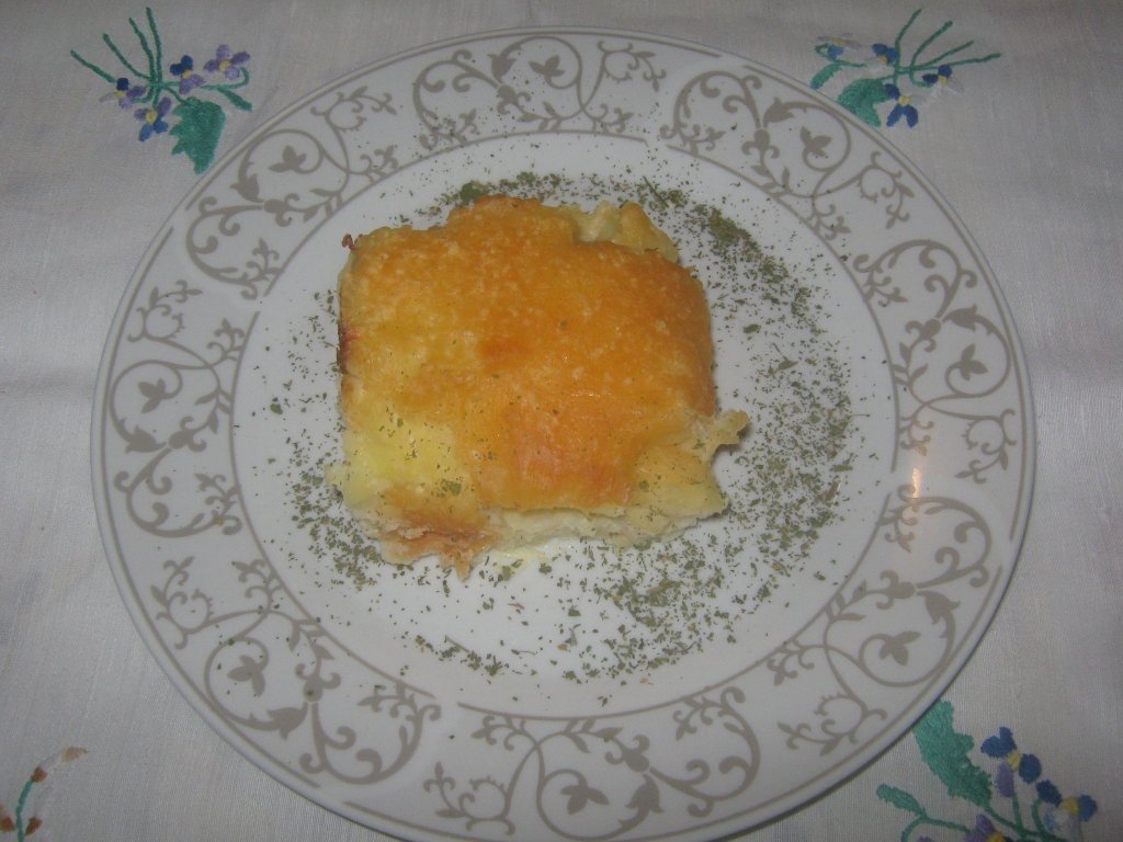 Se taie cartofi curatati in rondele foarte fine. Se aseaza jumatate din cartofi intr-un vas de yena (pentru cuptor)se adauga ceapa taiata fasi subtiri iar peste ceapa 100g de cascaval.Se adauga un pic de sare si piper dupa care cealalta jumatate de cartofi taiati subtiri la sfarsit se toarna smantana se acopera cu o foaie de aluminiu si se pune la fiert in cuptor la 200°. 30min dupa , se scoate de la cuptor se presareaza restul cascavalului se da iar la cuptor pana ce cascavalul este rumenit .Se serveste cald ;