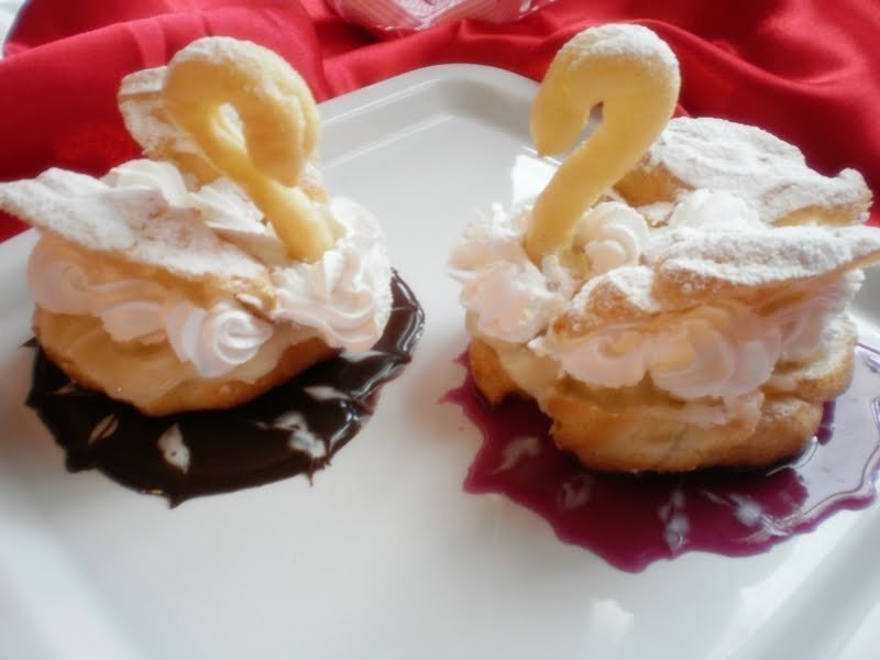 Taie gogoşelele pe mijloc şi umple-le cu frişcă(sau cu cremă de vanilie), apoi montează gâtul lebedei în frişcă.