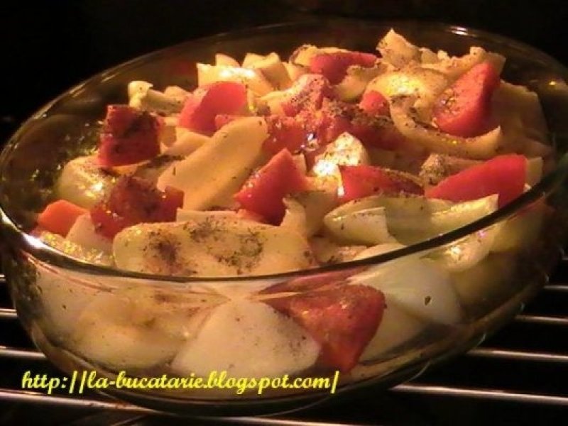 Intr-o olita pui bucatile de carne in apa cu sare la fiert. Spumezi, le mai lasi 10 minute si apoi le scoti pe o farfurie. Zeama in care a fiert carnea o pastrezi. Intr-un vas termorezistent pui toate legumele de mai sus. Condimentezi cu tot ce preferi, torni uleiul si jumatate din cantitatea de supa. Bagi la cuptor si amesteci o singura data, dupa 30 de minute, cand adaugi si bucatiele de carne peste legume. Lasi la cuptor pana este gata, dar eviti sa mesteci foarte mult. Stropesti cu putina zeama din cand in cand.