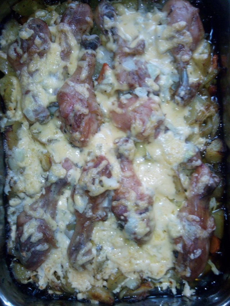 Se toarna sosul uniform peste carne si legume, se presoara cascavalul dat prin razatoare si se tine la cuptor aproximativ 20-25 minute