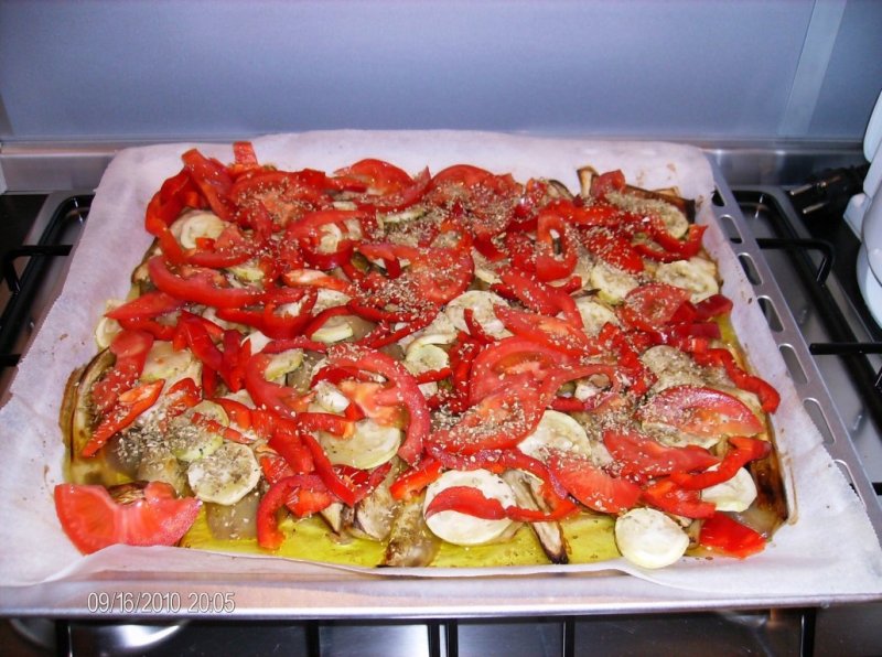 Se taie vinetele felii lungi si se dau cu sare. Dupa 10 minute se spala si se usuca. Dovlecii, ardeii si rosiile se taie rondele. Intre timp se incinge cuptorul.Se pregateste o tava tapetata cu foaie de pergament, se aseaza vinetele scurse si stropite cu ulei de masline, care se tin la cuptor 5 min. Apoi se adauga dovleceii, ardeii si rosiile, stropite cu ulei de masline, oregano si un praf de sare. Se lasa la cuptor pana se inmoaie. Se scot intr/un castron si se pot servi ca si garnitura langa friptura sau ca salata, stropita cu otet de vin sau mere.
