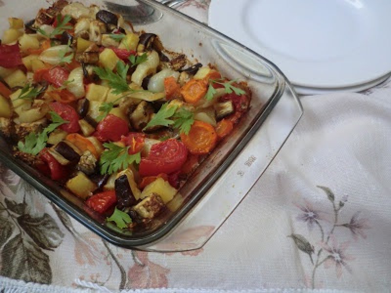 Cartoful curatat si spalat se taie cuburi egale, la fel se procedeaza su vanata si adeiul gras. Morcovul se taie rondele iar rosiile bucati destul de mari. Se pun legumele intr-o tava de yena se stropesc cu ulei, se condimenteaza cu sare, piper si busuioc , se amesteca bine, bine.