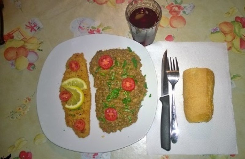 Se fierbe lintea. Prazul se taie rondele. Usturoiul se taie marunt sau se da pe razatoarea fina. Se caleste prazul, se pune lintea, se amesteca din cand in cand sa nu se prinda in pasta de rosii. Adaugam usturoiul, sare si piper peste linte si se lasa la foc potrivit. Se prepara fileul de peste trecandu-l prin pesmet si apoi se prajeste pana devine auriu. Se asaza pe farfurie impreuna cu lintea. Ca bautura eu am servit un pahar de merlot. Pofta buna! Astept parerile voastre si sa-mi spuneti daca ati incercat reteta.