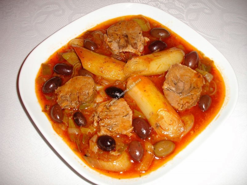 Se pun limbile spalate la fiert impreuna cu condimente: cimbru, piper, boia, 1 cub vegeta si orice condiment este pe gustul vostru pentru a-si lua gust. Dupa ce au fiert se curata de pielite cat sunt calde si apoi se taie fasii sau felii mai grosute. Se caleste ceapa tocata marunt, se adauga maslinele si se calesc si ele, se adauga prazul taiat rondele nu foarte subtiri ( eu am taiat cateva bucati mai mari pentru aspect) si se lasa sa se inmoaie bine si prazul. Mie imi place numai acest fel de masline si am auzit de la diversi ca sunt si mai sanatoase fata de cele negre care sunt tratate. Se adauga o parte din apa in care a fiert limba ( atat cat sa acopere prazul)si se lasa acoperit cu capac sa scada. Spre sfarsit se adauga limba déjà fiarta si se mai lasa putin. Se desface bulionul cu putina zeama si se adauga la mancare. Se mai baga la cuptor pentru vreo 15 minute sa mai scada. Se sareaza dupa gust daca mai este cazul avand in vederea ca maslinele sunt sarate. Se serveste cu un pahar de vin alb dar in lipsa lui putem bea unul rosu de tara.