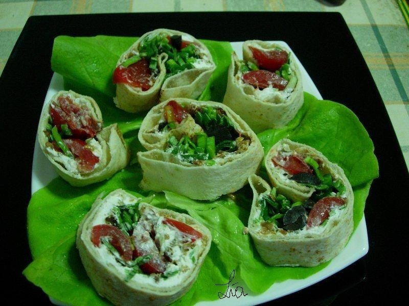 Intindem lipia pe o farfurie plata. Cu un cutit intindem branza pe toata suprafata, presaram jumarelele si alternam cu un rand de praz, rosii, masline si rulam cat mai strans.