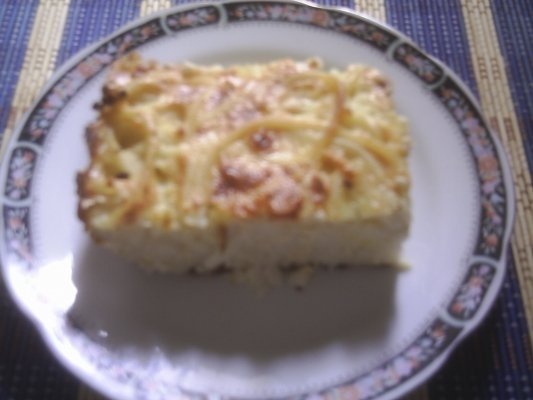 Macaroanele se fierb in apa cu putin ulei .Cand sunt fierte,strecurate se amesteca cu untul fierbinte .Se presara peste ele branza si cascaval dupa gust,cateva linguri de smantana amestecata cu putin iaurt si 2 oua.Se amesteca bine macaroanele cu restul ingredientelor si se toarna intr-un vas de yena uns cu unt. Vasul se introduce la cuptor.Cand a inceput sa se lege compozitia se toarna 1 ou batut deasupra si se lasa la cuptor pana se gratineaza frumos. Se servesc ca atare sau cu zahar.