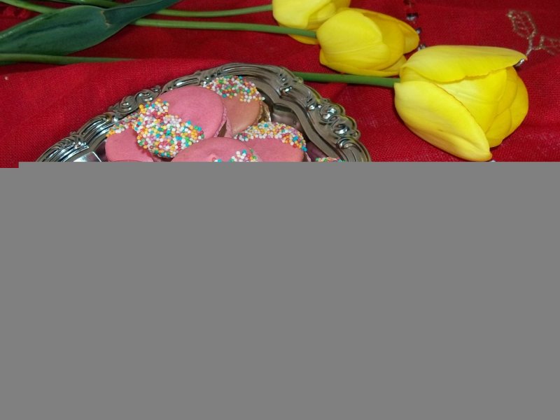 In vasul robotului de bucatarie se pune zaharul pudra si faina de migdale si se amesteca pana la omogenizare.Apoi se cerne amestecul de 2-3 ori si aruncati mereu ce ramane in sita. Separat se bat albusurile,se adauga zaharul tos si se bat in continuare pana devine o spuma tare.Dupa preferinta,acum este momentul sa punem si colorantul,daca dorim sa obtinem macarons colorati.Amestecul de faina de migdale si zahar pudra se adauga treptat in trei pasi,adaugand mereu cu paleta de jos in sus.