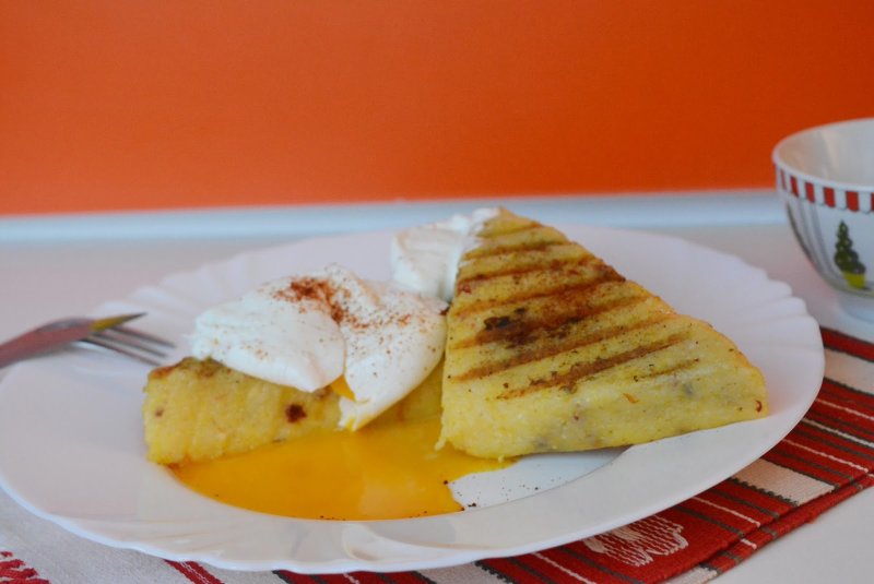 TIPS: Ideea a fost de a servi un mic dejun copios. Mamaliga am inbogatit-o cu branza framantata si rosii uscate in ulei de masline, apoi rumenita la grill. In starea asta se poate servi atat rece cat si calda ca aperitiv. Pentru ca eu am pregatit-o pentru mic dejun, i-am adaugat cate un ou posat de fiecare persoana si cate o lingura de branza dulce amestecata cu smantana, pudrate cu paprika afumata. Nu ramane decat sa probati si sa constatati singuri cat este de delicios….