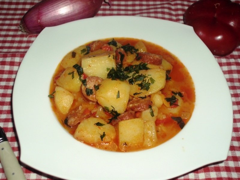 Curatam,spalam si tocam cartofii cat pentru o inghititura. Curatam si spalam legumele,apoi tocam ceapa si ardeiul cubulete,iar morcovii se taie rondele. Taiem si carnatii in felii potrivit de groase. Punem uleiul la incins,adaugam carnatii si lasam sa se rumeneasca usor. Adaugam si ceapa, apoi ardeii si morcovii. Punem cartofii si acoperim cu apa. Lasam sa fiarba la foc mic,pana sunt patrunse bine toate legumele. Adaugam pasta de tomate si potrivim de sare. Lasam sa mai dea in cateva clocote,apoi oprim mancarea si adaugam verdeata.
