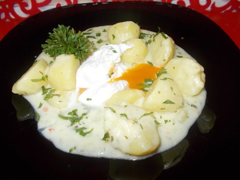 Servim cartofii, cu sos alaturi, si cate un ou romanesc.Deasupra mai putem presara patrunjel verde.