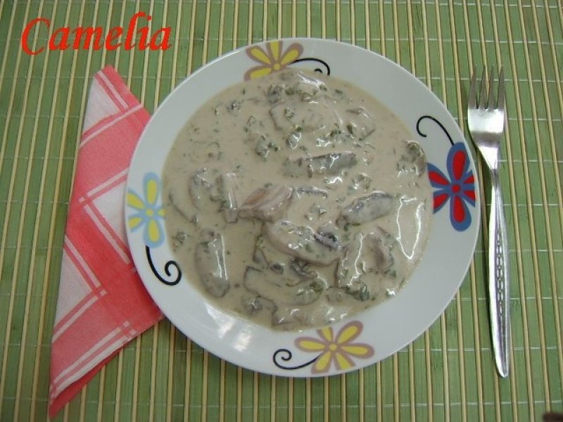Se spala bine ciupercile si se taie feliute. Se toaca ceapa cubulete si se prajeste intr-o cratita in care s-a pus ulei. Cand ceapa s-a prajit peste ea se pun ciupercile. Ciupercile vor lasa destula apa, dar mai adaugam o cana ca sa fie fierte bine. Se adauga secretul gustului. Se freaca cele 2 linguri de faina cu apa rece intr-o cana si se pune peste ciuperci. Se amesteca continuu ca sa nu se prinda de fund. Se pune usor smantana ca sa nu se taie, iar la sfarsit patrunjelul.