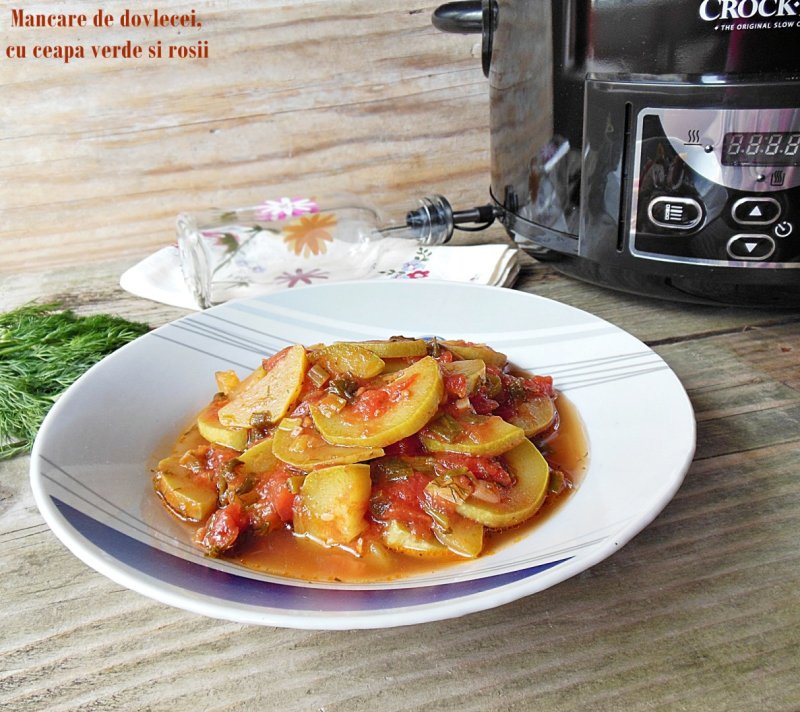 In vasul Crock Pot punem uleiul, ceapa verde, dovleceii si rosiile.
