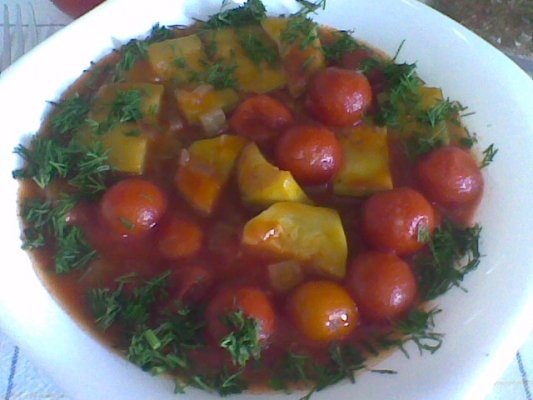 Se calesc cepele, in cele doua linguri de ulei de masline circa doua minute,apoi adaugam dovleceii si cartofiori taiati rondele.Adaugam pasta de tomate,sare piper,menta uscata,si cutia de pomodorini( rosii Cherry). Le lasam 5 minute pe aragaz si apoi le bagam la cuptor pentru 30 minute.Cu 10 minute inainte sa inchidem focul la cuptor facem din cele doua linguri de amidon alimentar un sos, pe care il adaugam peste mancare si mai lasam 10 minute la cuptor. Pofta buna !!!