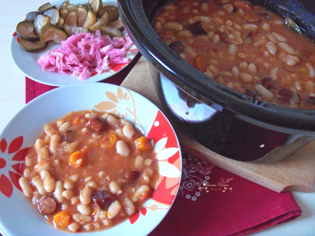 A doua zi, se pun in vasul de la aparatul crock-pot urmatoarele: fasolea boabe, apoi legumele spalate si taiate marunt. Eu am pus si carnati: cabanosii sunt preferatii mei. Deasupra se pun mirodeniile: sare, foi de dafin. Eu am folosit si vegeta de casa (patrunjel radacina, morcov ras, ardei kapia rosu). Apoi se adauga bulionul si rosiile si se acopera cu apa. Initial am pus cam 400 ml apa, am setat aparatul la functia high si l-am lasat 4 ore, dar pentru ca fasolea nu era foarte patrunsa, am mai completat cu aprox 200 ml apa si am mai lasat cam doua ore.