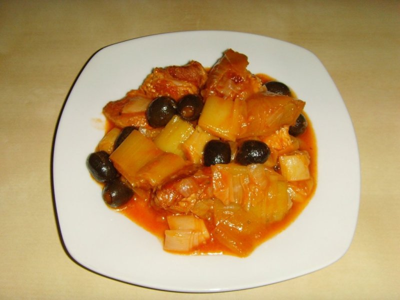 Peste ceapa adaugam carnea si prazul oparit si le lasam cateva momente la calit.Dupa care adaugam apa fiarta cat sa le acoperim.Le lasam sa fiarba la foc potrivit 20 minute.Adaugam maslinele,feliile de lamaie,potivim de sare si piper.
