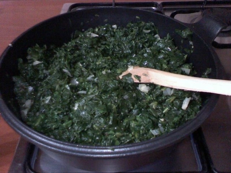 Am curatat si tocat doua cepe potrivite.Le-am calit in putin ulei de masline si apoi am adaugat si spanacul. Peste ele am adaugat cam doua polonice de apa sa aiba si el in ce sa se fiarba. Am asezonat cu delikat si in 20 de minute a fost gata. Eu nu am mai pus si faina ca nu-mi place dar pentru cine il vrea mai legat poate sa desfaca o lingura de faina in putina apa. Nu am adaugat carne pentru ca l-am vrut ca si garnitura.